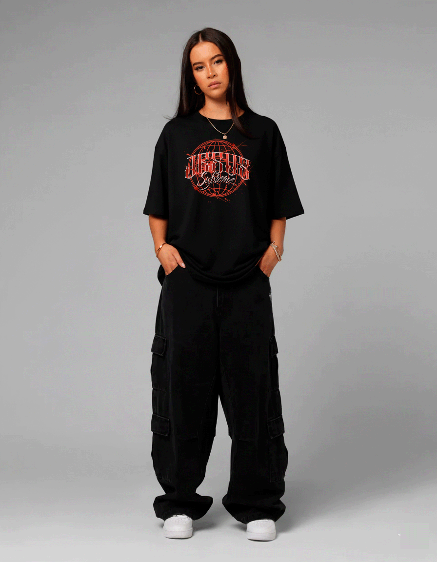 A estampa frontal, aplicada por impressão digital direta (DTG) de alta definição, traz um globo em vermelho intenso e o lettering Jesus Supreme com inspiração global — uma fusão entre espiritualidade e estética urbana.